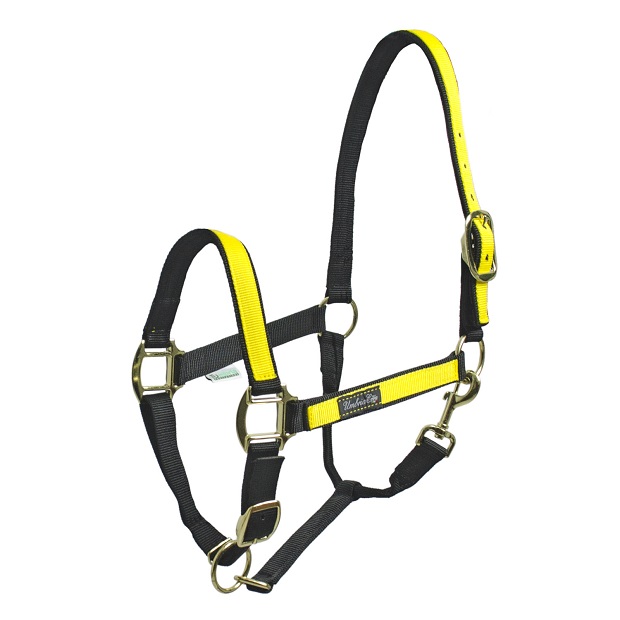 Cavezza nylon doppio, con riporto colorato, fibbie in ottone, doppia regolazione.