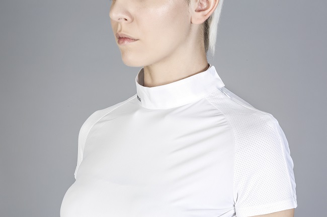 Polo da donna slim fit in tessuto tecnico traspirante. Maniche corte e collo alla coreana con bottoni laterali a scomparsa.