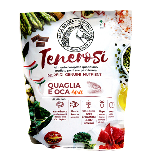 Quaglia fresca 30% , Oca disidratata 24,8% , Patate, Proteine vegetali, Piselli, Mele fresche 1% , Olio di pesce 1,5% (olio di fegato di Merluzzo, olio di Salmone) Collagene di pesce, Uova fresche di Montagna 1% , Yogurt fresco, Sale marino, Olio extra vergine di Oliva Italiano, Broccoli freschi 0,5% , Gel di fico d’India fresco 0,5% , Coste fresche, farina di carrube disidratate 0,5% , Miele fresco, Sali minerali, Pool naturale di 5 nucleotidi da lievito di birra idrolizzato, Erbe aromatiche e officinali (Rosmarino fresco foglie, Salvia fresca foglie, Alloro, Erba Medica foglie, Bardana fresca foglie, Malva fresca foglie, Timo fresco foglie, Origano fresco foglie, fiori di Camomilla essiccati).